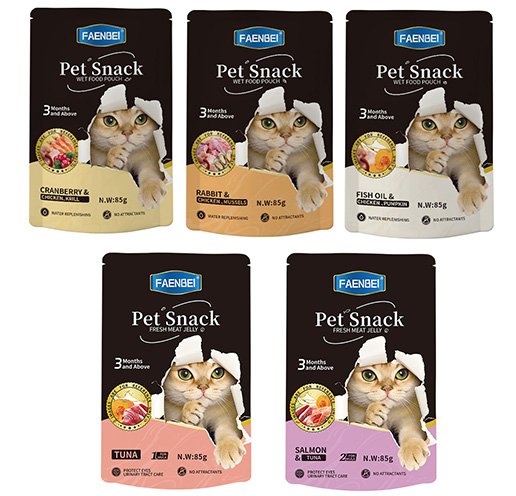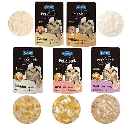 | FSP02-5 Pet Snack Wet Food Pouch-Salmon & Tuna | Raw material Purified Water, Tuna, Salmon, Fish oil Pumpkin, Additives:Carrageenan,Hydroxypropyl Distarch Phosphate,Taurine,lsomaltooligosaccha-ride, Vitamin A Acetate. Vitamin B2, Niacin.Calcium D-Pantothenate, Vitamin D3 |