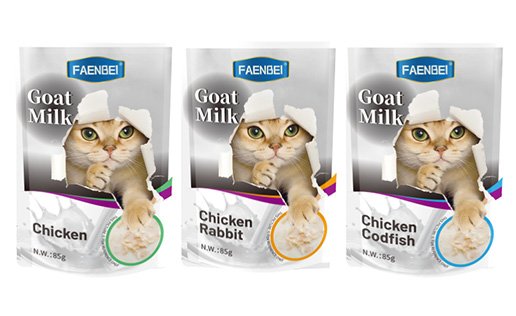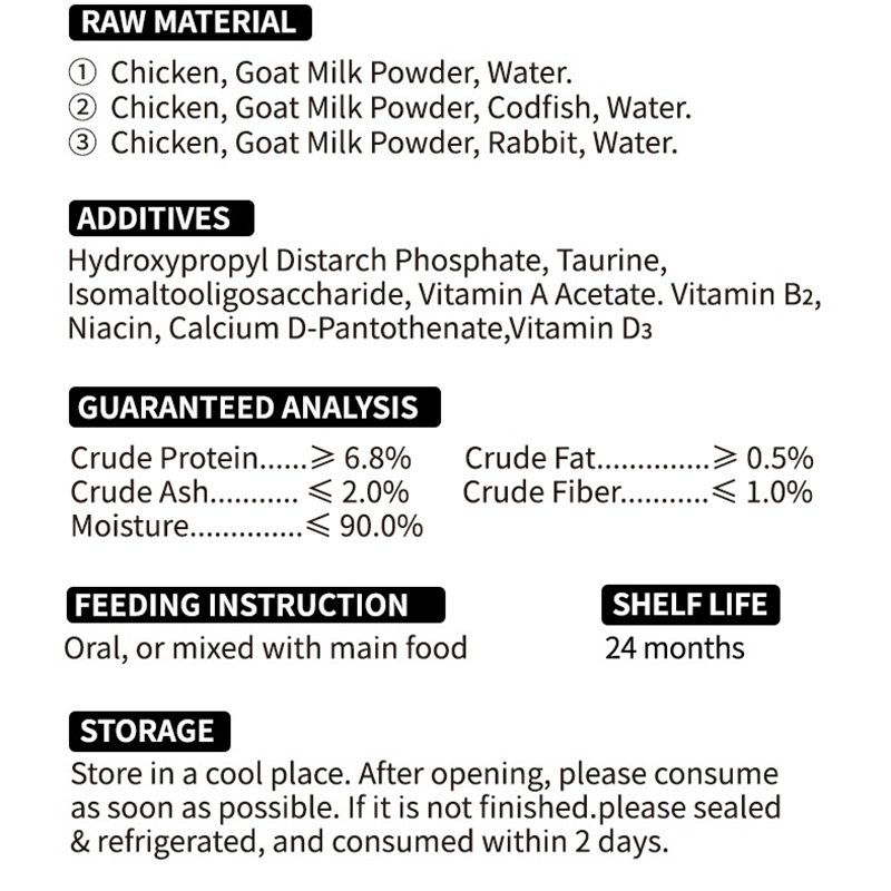 | FSP03-3 FAENBEI Goat Milk Chicken FAENBEI | Ingredients: Chicken, Water, Whole Goat Milk Powder. Additives: Hydroxypropyl Distarch Phosphate, Taurine, lsomaltooligosaccharide, VitaminA Acetate, Vitamin B2, Vitamin D3 |
