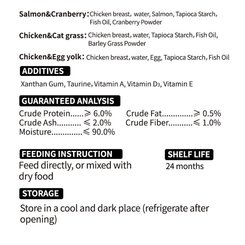 | FAENBEI Cat Treat Bar Chicken & Egg Yolk | RAW MATERIALS:Chicken breast, water, Egg, Tapioca Starch, Fish Oil ADDITIVES:Xanthan Gum, Taurine, Vitamin A, Vitamin D3,Vitamin E |