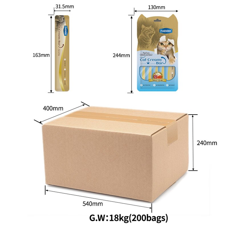 | FAENBEI Cat Treat Bar Tuna & Fish Roe | RAW MATERIALS:Chicken breast, water, Tuna, Shrimp, Tapioca Starch ,Fish oil ADDITIVES:Xanthan Gum,Taurine,Vitamin A,Vitamin D3,Vitamin E |