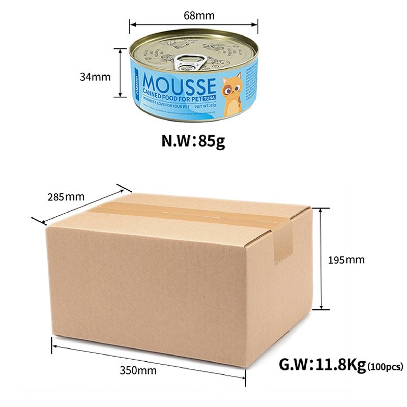 | Can Food for Cat Mousse-Tuna | RAW MATERIAL Chicken breast, Tuna, Chicken liver,Chicken heart, Chicken skeleton paste, Carrots, Water. ADDITIVES Hydroxypropyl distarch phosphate ester, guar gum, taurine,vitamins (A,D3,E),ferrous sulfate,copper sulfate, zinc sulfate manganese sulfate,calcium iodate, yeast selenium. |