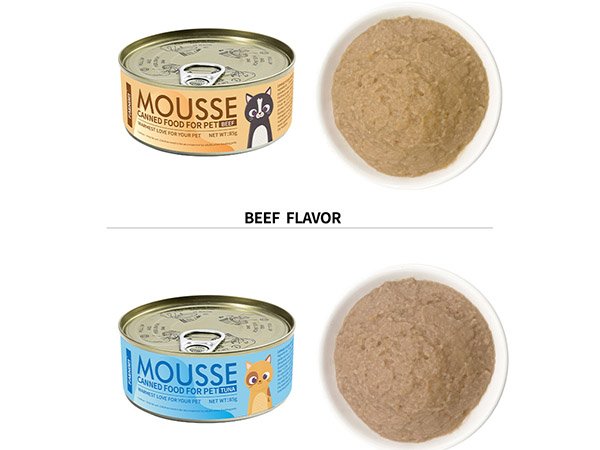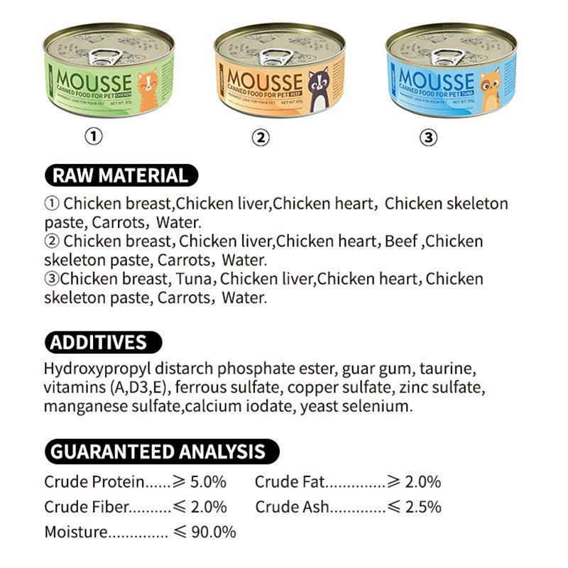 | Can Food for Cat Mousse-Beef | RAW MATERIAL Chicken breast, Chicken liver,Chicken heart, Beef ,Chicken skeleton paste, Carrots, Water ADDITIVES Hydroxypropyl distarch phosphate ester, guar gum, taurine,vitamins (A,D3,E),ferrous sulfate,copper sulfate, zinc sulfate manganese sulfate,calcium iodate, yeast selenium. |