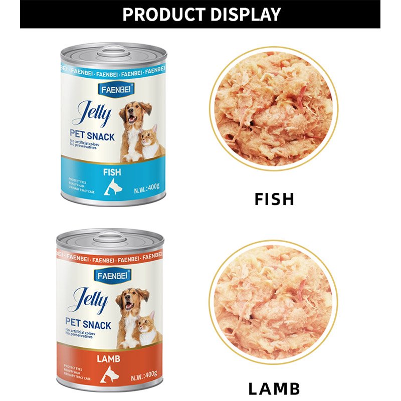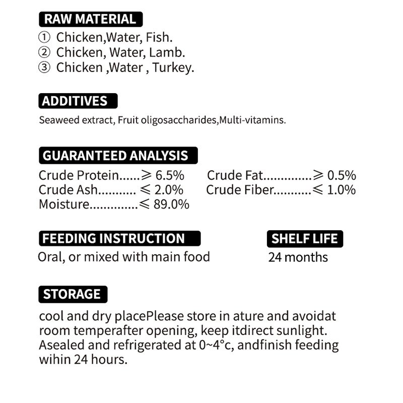 | Can Food for Cat & Dog Jelly-Fish | RAW MATERIAL Chicken,Water, Fish. ADDITIVES Seaweed extract, Fruit oligosaccharides,Multi-vitamins. |