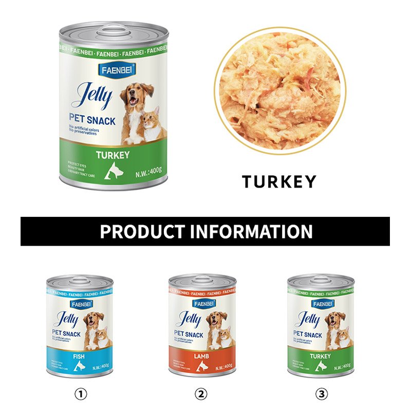 | Can Food for Cat & Dog Jelly-Turkey | RAW MATERIAL Chicken ,Water , Turkey. ADDITIVES Seaweed extract, Fruit oligosaccharides,Multi-vitamins. |