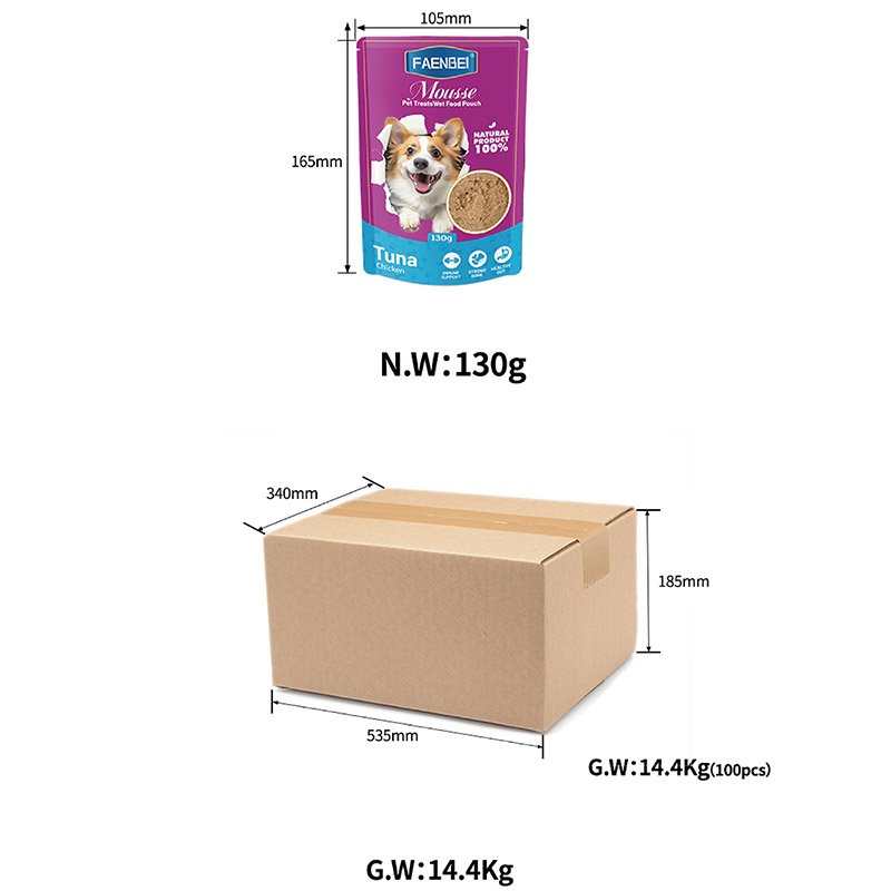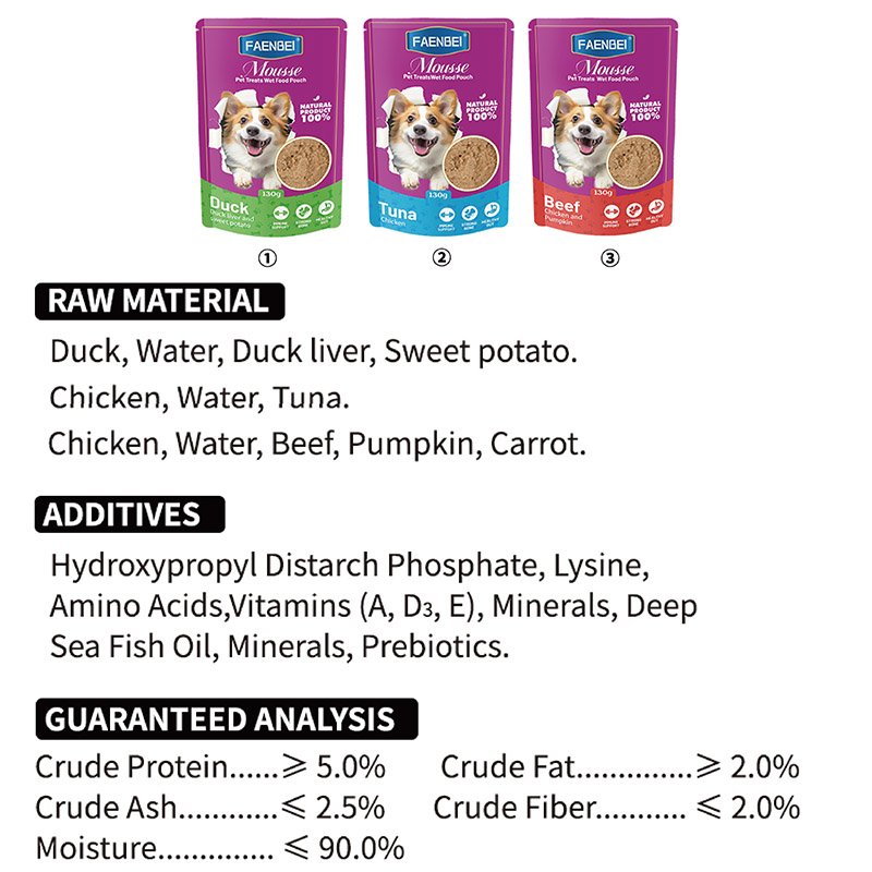 | Mousse Pet Treats Wet Food Pouch-Beef & Chicken & Pumpkin | RAW MATERIAL Chicken, Water, Beef, Pumpkin, Carrot. ADDITIVES Hydroxypropyl Distarch Phosphate, Lysine,Amino Acids,Vitamins (A, D3, E),Minerals, DeepSea Fish Oil, Minerals, Prebiotics. |